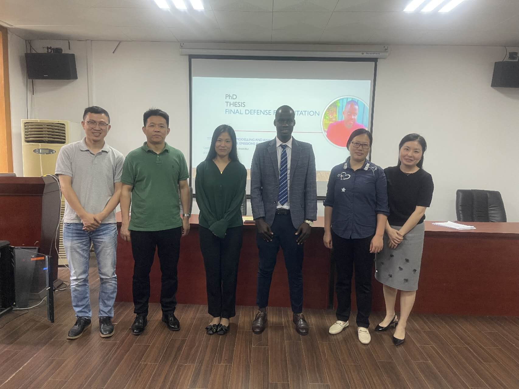 Before the thesis defense began, Mr. Liu Yuzi introduced the procedure, rules and other requirements of our overseas doctoral graduation defense. At the beginning of the defense, students went on stage in turn to make a comprehensive presentation on the background and significance of the dissertation topic, the current status of research at home and abroad, the content of the research, the research methodology and the work plan. Rizwan Munir, an overseas PhD student of the class of 2020, discussed the use of improved non-parametric statistical quality control charts in the monitoring process. Twahil Hemed Shakiru, an overseas PhD student of the class of 2021, presented his dissertation on statistical modeling and analysis of carbon dioxide emissions in East Africa. Khin Sandi Myint, an overseas PhD student of the class of 2021, used supervised learning methods to study domestic violence in Myanmar. The professors asked questions, affirmed or challenged the issues in the students' presentations, suggested modifications, and finally graded them according to the specific assessment indicators of the Overseas Doctoral Graduation Defense Grading Criteria.