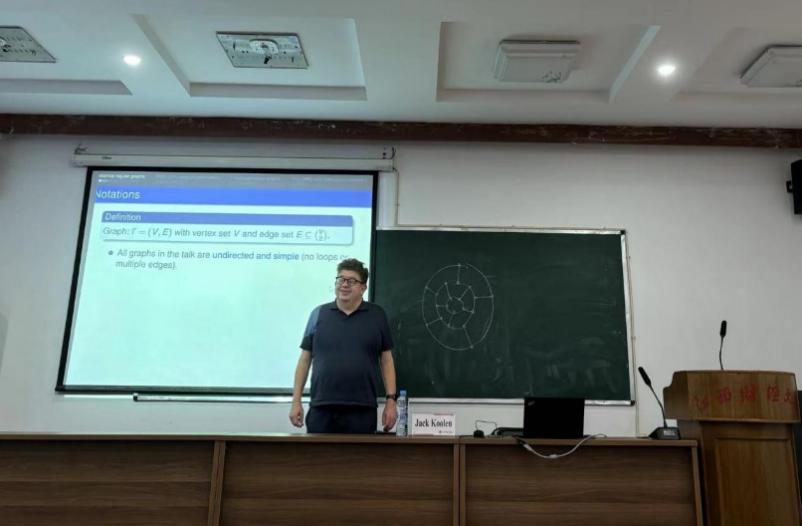 Next, Professor Jack Koolen explained distance-regular graphs with classical parameters. He began by defining the concept, then introduced the principles of Grassmann graphs and bilinear forms. He then gave a detailed explanation of his own research on distance-regular graphs with classical parameters.