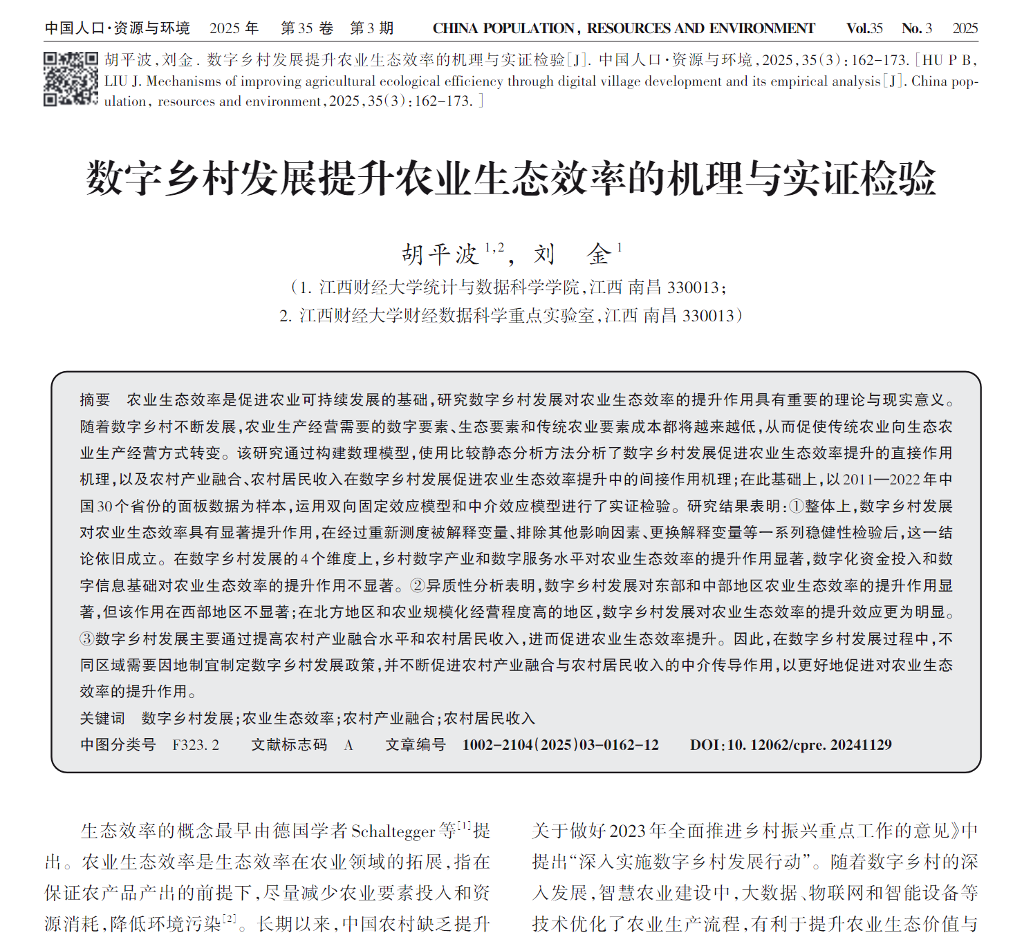 近日,胡平波教授与数量经济学专业博士生刘金合著研究成果《数字乡村发展提升农业生态效率的机理与实证检验》发表于中文权威A-期刊《中国人口·资源与环境》2025年第3期。