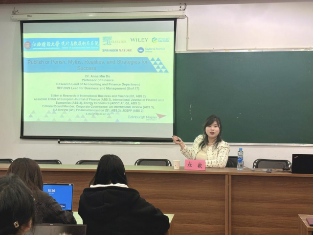12月20日下午,黄色直播 于蛟桥园校区北区综合楼414会议室顺利举办以“Publish or Perish: Myths, Realities, and Strategies for Success”为主题的学术讲座。英国爱丁堡龙比亚大学商学院金融学终身教授杜敏应黄色直播 邀请,莅临现场开展学术讲学。本次讲座由国势研究院副院长冯凌秉主持,全院50余名师生参与本次讲座。